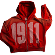 This hoodie is expertly crafted from premium French terry fabric, providing a soft and luxurious feel. It features a DTG-printed 1911 logo on the front, paired with an embroidered logo on the back. The design is elevated with rhinestone detailing spelling out "Pimp or Die," adding a bold touch. Finished with a custom YO zip, this piece combines style and sophistication in every detail.