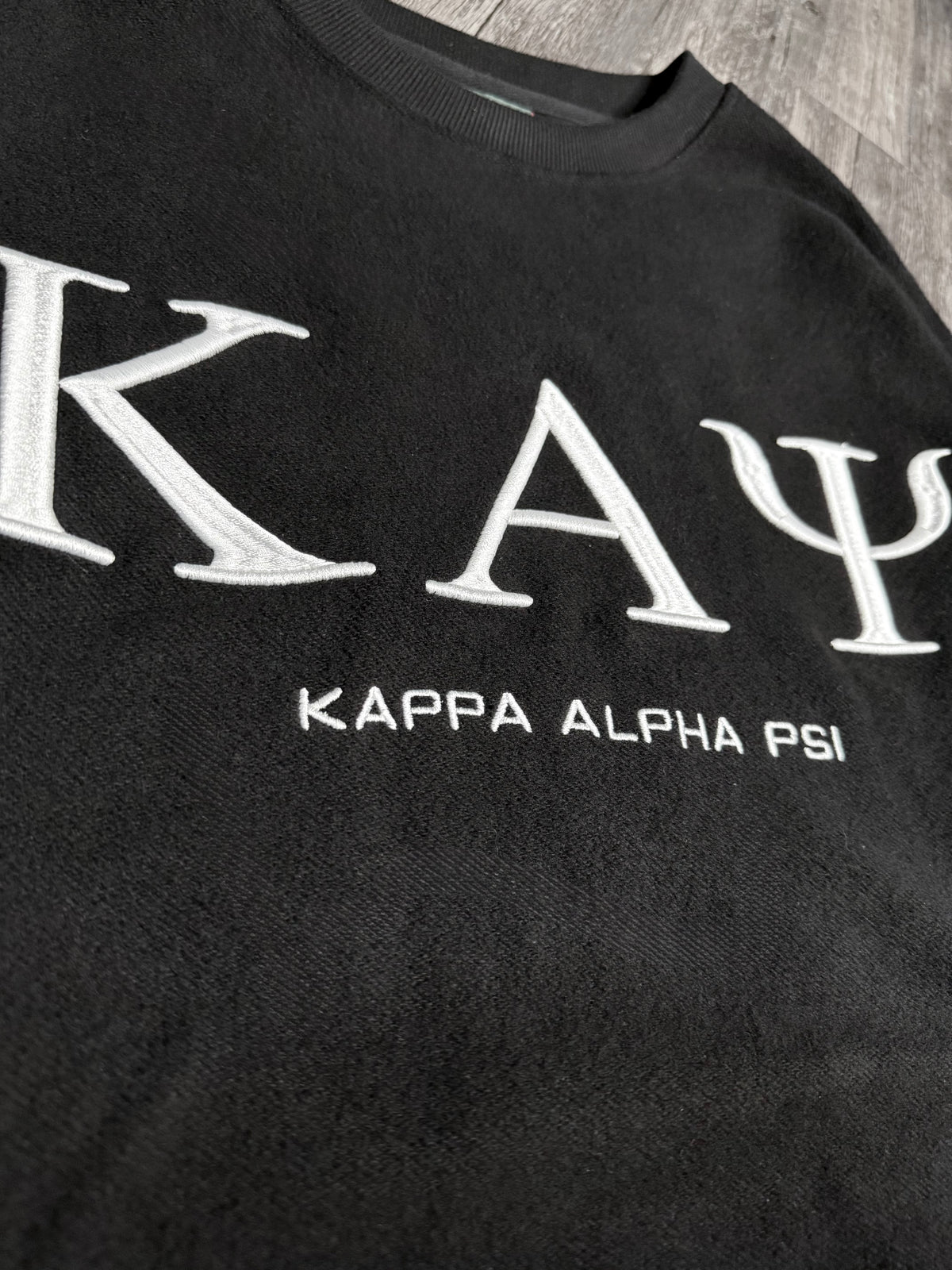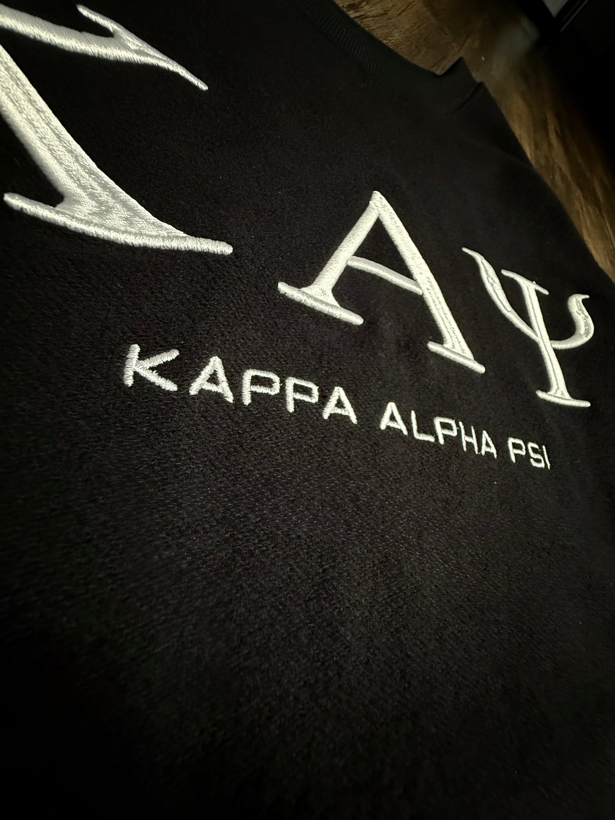 The design features the ΚΑΨ (Kappa Alpha Psi) Greek lettering embroidered across the chest in bold white 3d embroidery, paired with the full fraternity name “Kappa Alpha Psi” stitched below in clean typography.